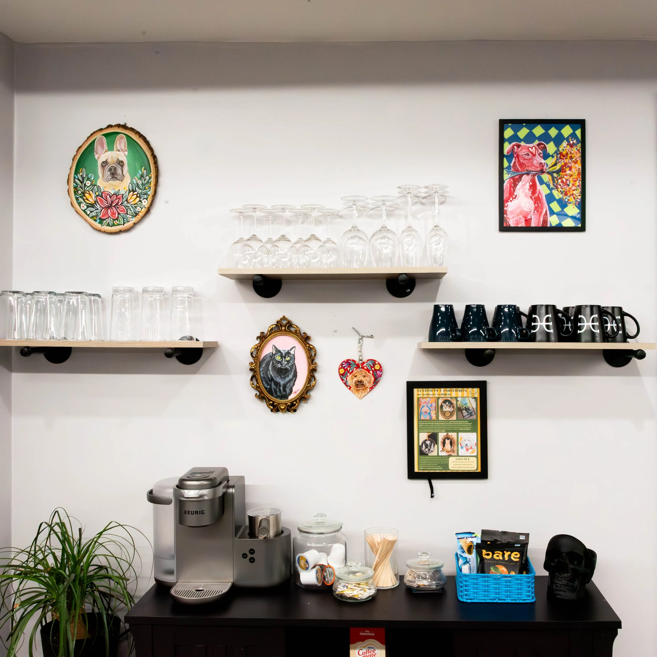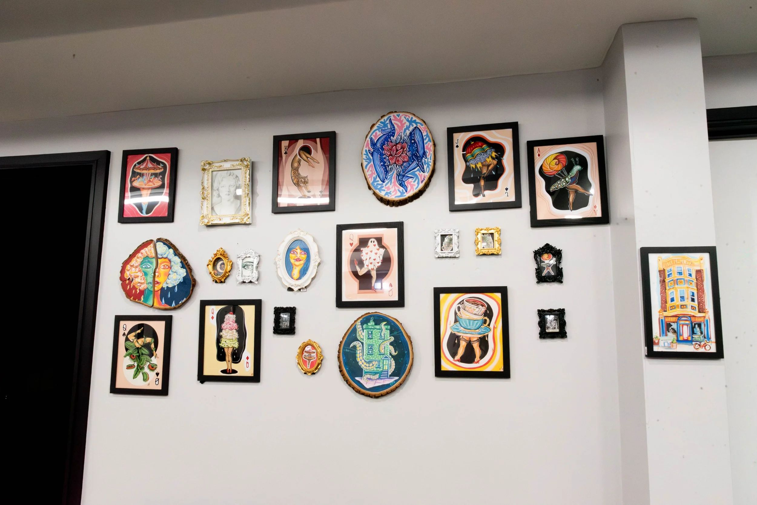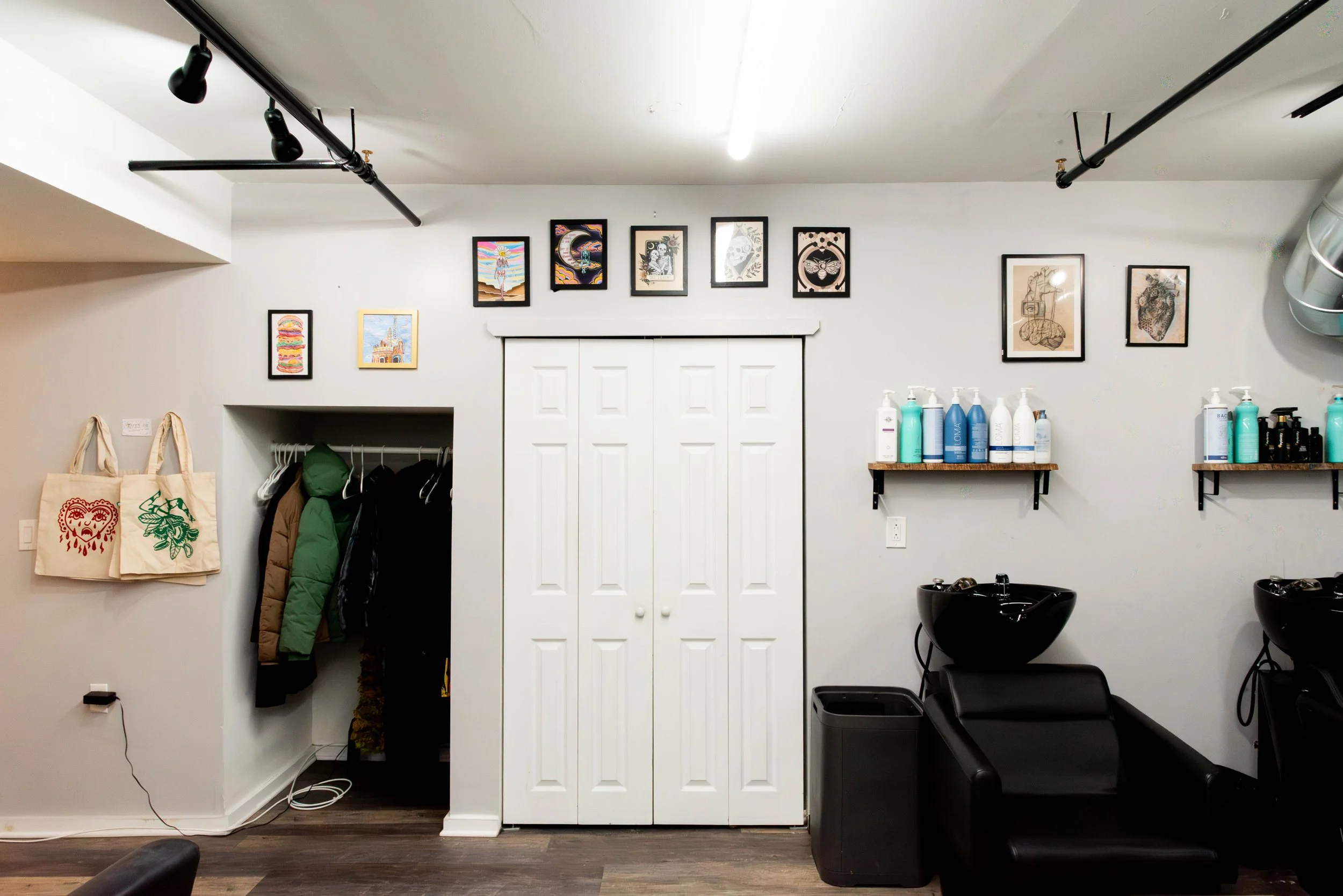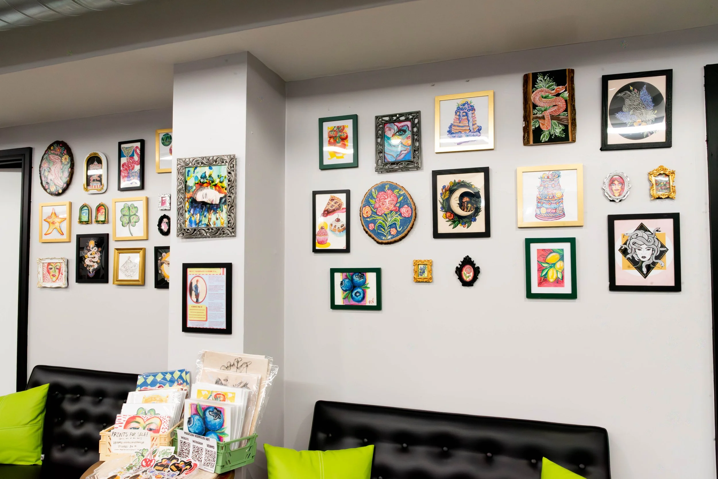 Each wall is decorated, gallery wall style, plus work to fill in the rest of the space. Each salon station is accented with a hand-painted mirror as well.
